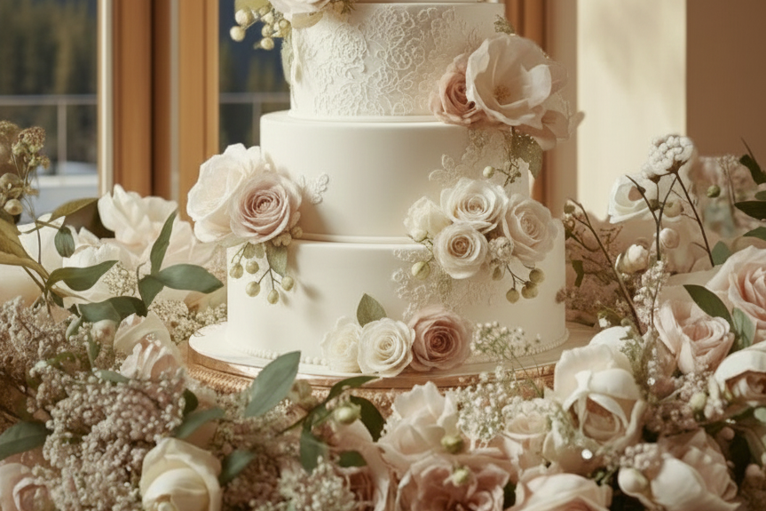 Floral or Styling Accents (Venue-Approved) Thoughtfully applied loose florals, greenery, or sculptural elements can elevate the cake design without competing with it. Close coordination with the florist ensures material selection, scale, and placement feel intentional and cohesive within the overall aesthetic. Why I recommend it: It softens the presentation while visually anchoring the cake within the broader design narrative of the celebration.